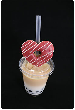 | ミュゼ・ドゥ・ショコラ テオブロマの松屋銀座限定 タピオカカカオミルクティー×ドーナツ 751円。カカオニブから抽出したカカオティーにミルクと黒糖タピオカを入れ、苺チョココーティングした焼きドーナツをのせて。 |